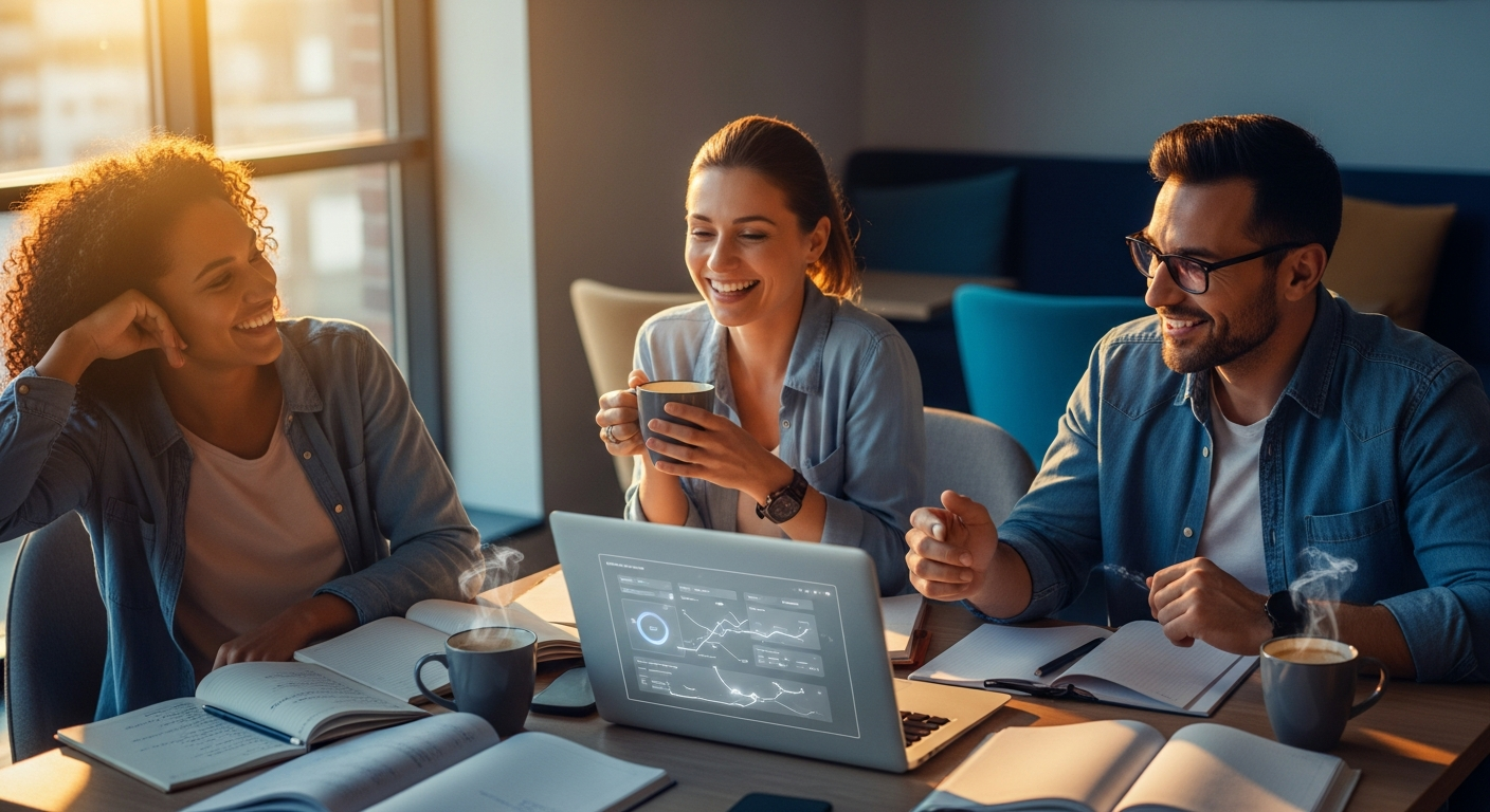 Three adult exam candidates smiling together around a laptop after a successful practice session
